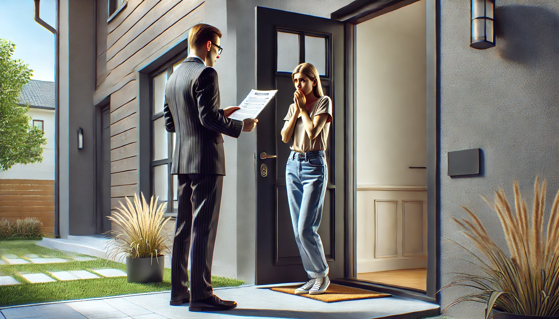 DALL·E 2025-11-08 20.23.17 – A realistic and modern widescreen scene showing a notary at the front door of a contemporary house, reading an official document to a woman. The notar