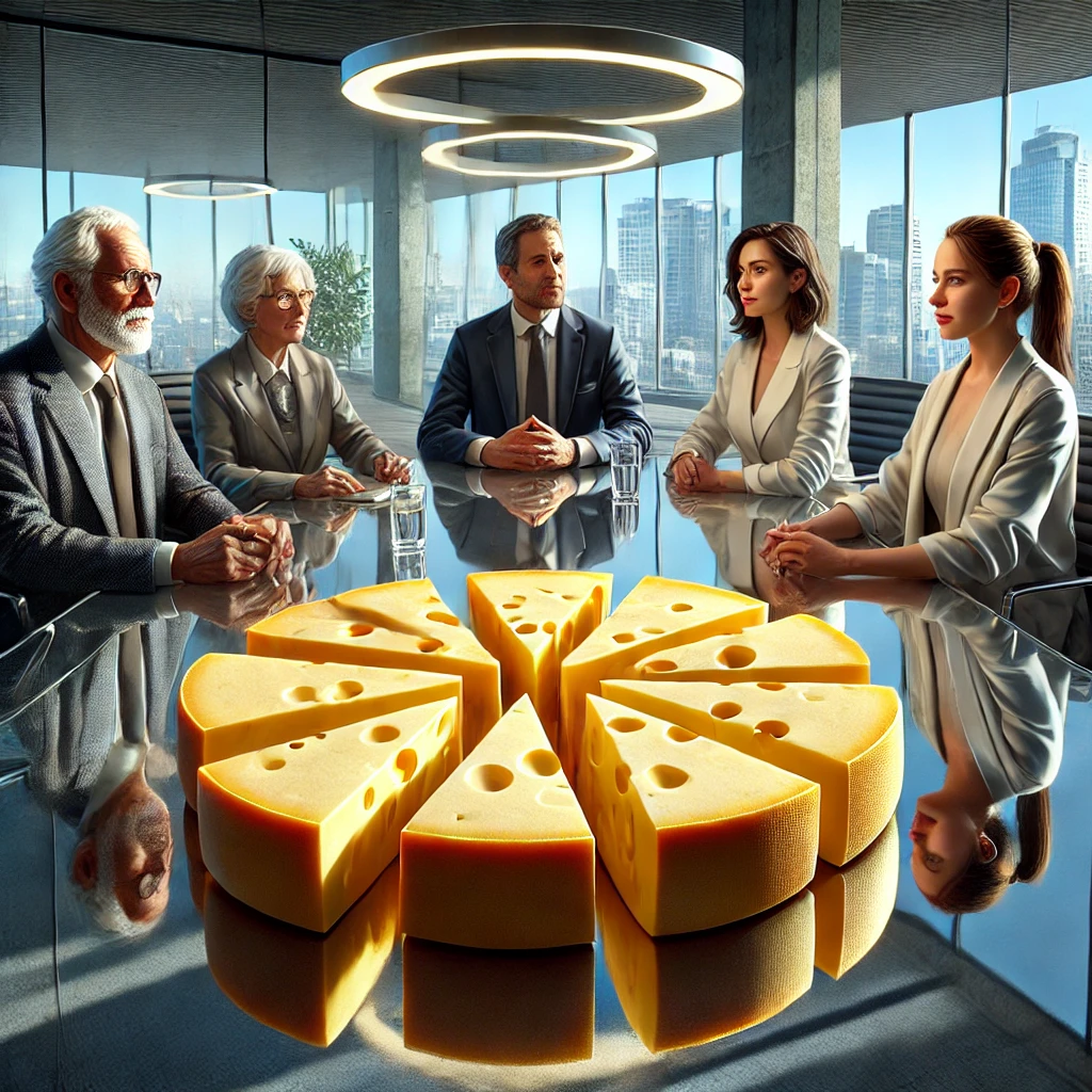 DALL·E 2025-02-17 11.53.29 – A highly realistic painting of a round cheese cut into six portions on a modern glass office table. Three people are sitting around the table_ an elde