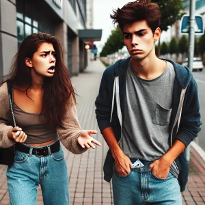 DALL·E 2025-03-30 20.16.46 – A young couple walking together, both visibly angry. The young woman is asking the man for money, gesturing with frustration. The young man, looking s