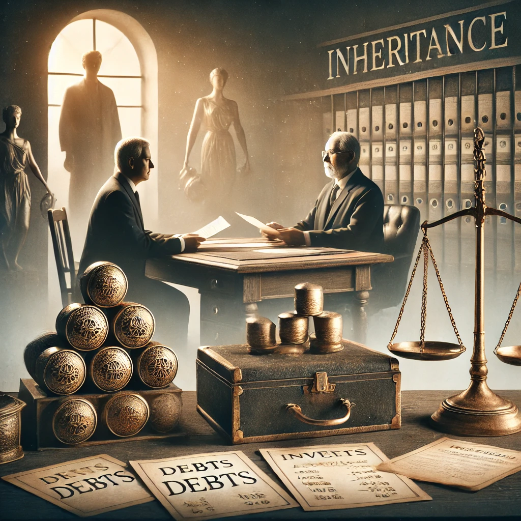 DALL·E 2025-04-12 11.04.42 – A symbolic legal scene representing the liquidation of inheritance with the benefit of inventory. In the center, an old wooden desk is covered with le
