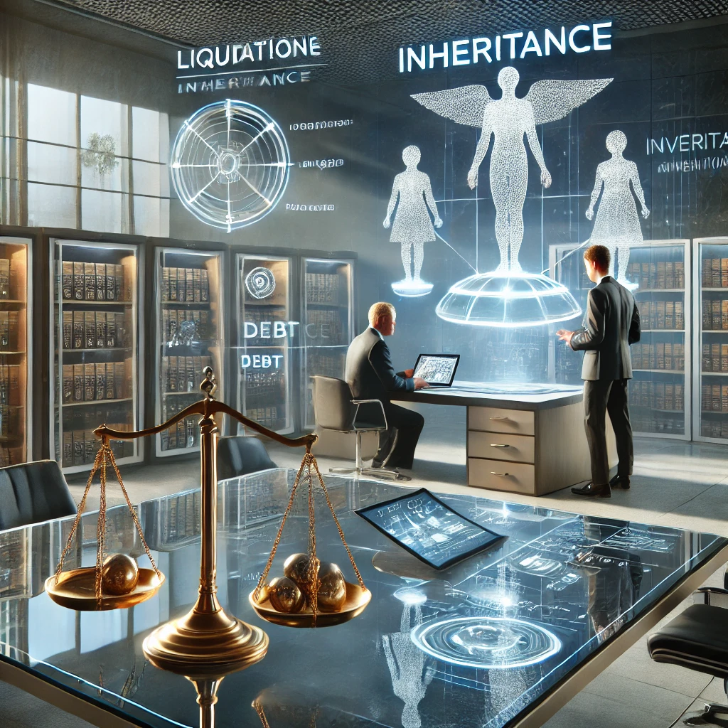 DALL·E 2025-04-12 11.04.49 – A modern legal scene symbolizing the liquidation of inheritance with the benefit of inventory. A sleek, contemporary office with a glass desk holding