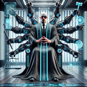 DALL·E 2025-04-12 11.28.44 – A realistic depiction of a futuristic all-powerful judge from the year 2025 with eight muscular arms, resembling an octopus. The judge is wearing a sl