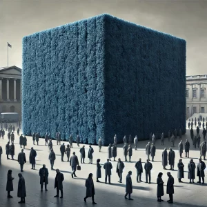 DALL·E 2025-06-08 14.36.41 – A tall and dense cobalt blue hedge, looking artificial and impenetrable, shaped with angular and asymmetric cuts, stands like a wall in the center of