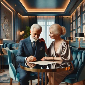 DALL·E 2025-09-14 19.59.27 – An elderly man and woman sit at a luxurious table inside a richly decorated room. The dominant color is petroleum blue, seen on modern velvet furnitur