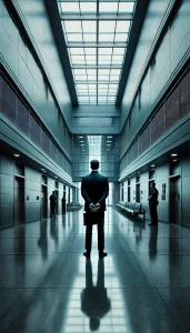 DALL·E 2025-12-24 14.54.48 – Hyperrealistic vertical photograph, editorial legal reportage style. A long, empty corridor inside a modern courthouse, institutional architecture wit